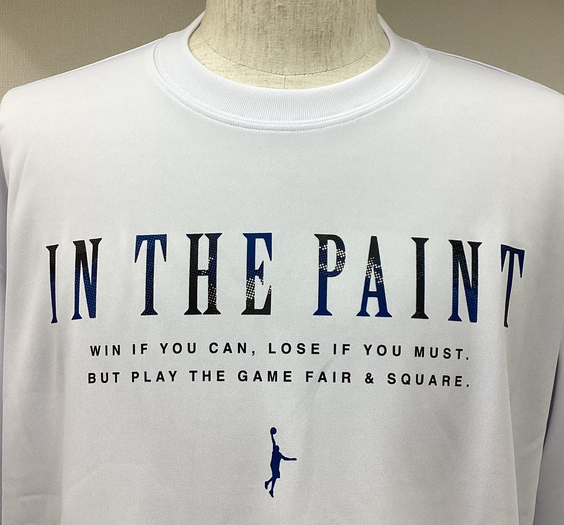 あざやかな赤と深みのある青をシャツの胸元のIN THE PAINTの文字に採用。